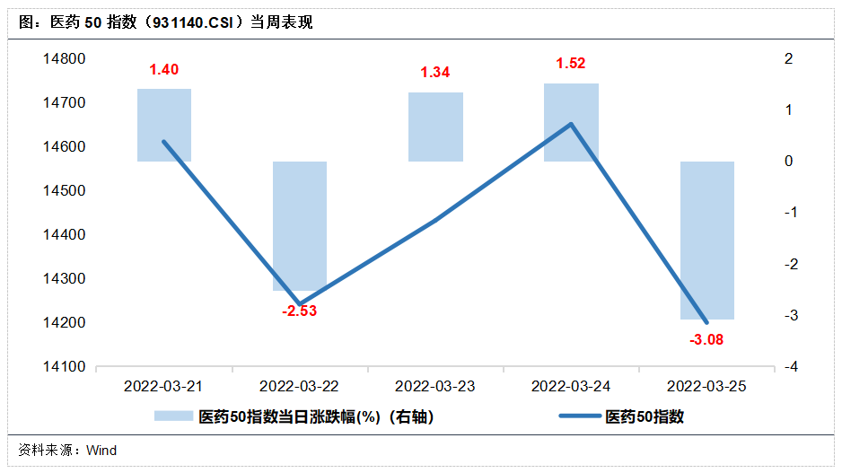 3月21日至3月25日跟踪标的医药50指数(931140.CSI),周五出现周中最大跌幅3.08%,截至周五收盘,指数全周累计下跌1.35%,相比沪深300指数跑赢0.79个百分点。