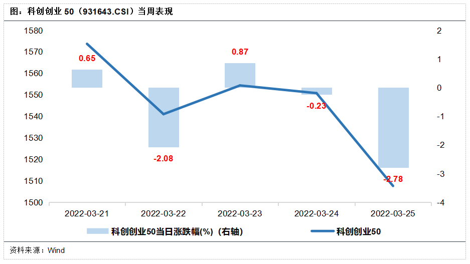 上周科创创业50指数震荡下行,指数全周累计下跌3.58%,相较沪深300指数跑输1.44%。