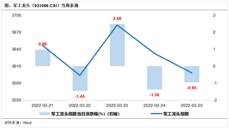 上周军工龙头指数总体下行,全周涨跌幅为-0.3%。其中,周一、周三上涨,涨幅分别为0.98%、2.48%,周二、周四、周五下跌,跌幅分别为-1.45%、-1.36%、-0.95%;收于3598.05。