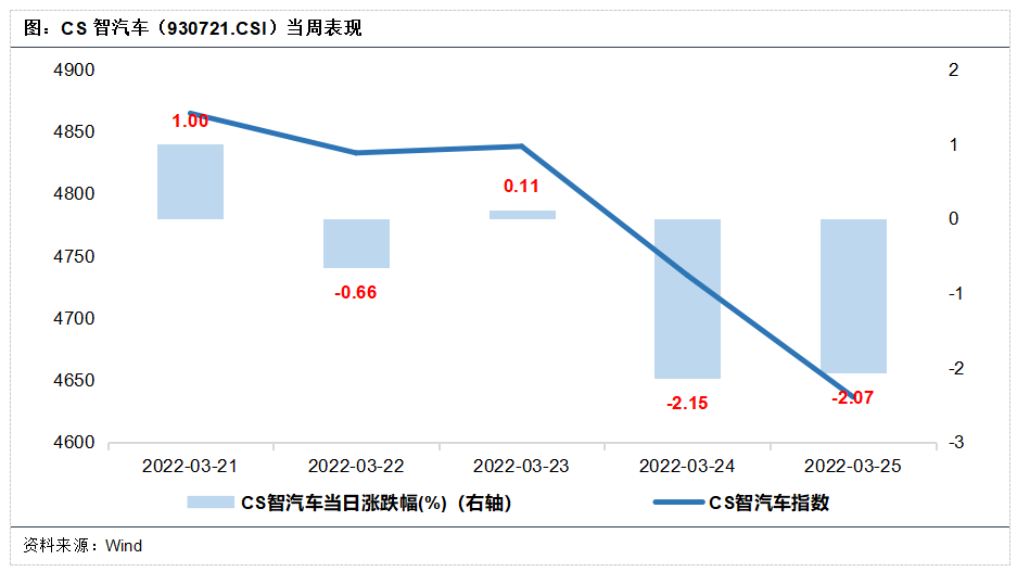 上周CS智汽车指数震荡下行,全周累计下跌3.76%,相较沪深300指数跑输1.62%。