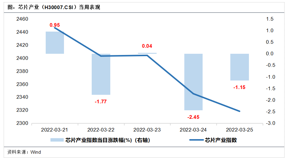 上周芯片产业指数周一小幅上涨,之后几日连续下跌,全周累计下跌4.38%,相较沪深300指数跑输2.23%。