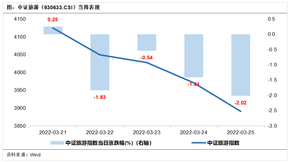 上周中证旅游指数震荡下行,全周累计下跌5.55%,相较沪深300指数跑输3.41%。