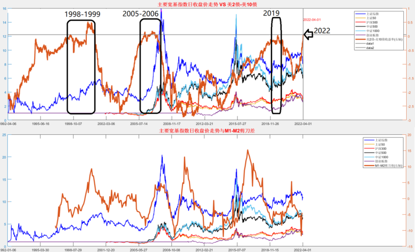 过去30年中,美国2年期国债收益率高于10年期国债收益率,也即美债收益率倒挂的情形一共出现过4次,分别是1998-1999、2005-2006、2019,以及当下。前三次出现的时候,虽然大盘也有可能有过下跌(在这个下跌的案例中,主要是大盘前期已经经历了明显的上涨,有一定的调整诉求),但在国内M1-M2剪刀差震荡往上的大背景下,A股最终还是走出了震荡上行甚至是明显上涨的行情来。
