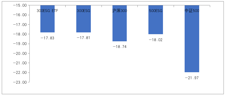 2022年以来股票市场整体是震荡下行的,然而ESG指数跌幅更小一些、抗风险能力更强一些,比如:300ESG比沪深300指数跌幅更小,500ESG指数跑赢中证500指数约4%,这就使得:500ESG指数的跌幅甚至小于沪深300的跌幅。300ESGETF跟踪的是300ESG指数,所以300ESG ETF的涨幅跌幅和300ESG指数基本一致。