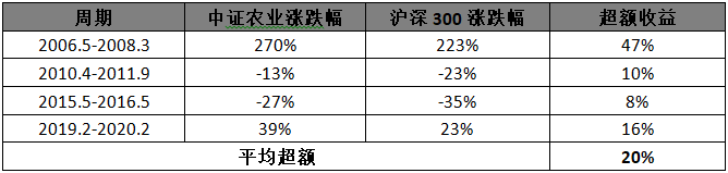 表:历次猪周期上行周期中中证农业相比于沪深300的涨幅