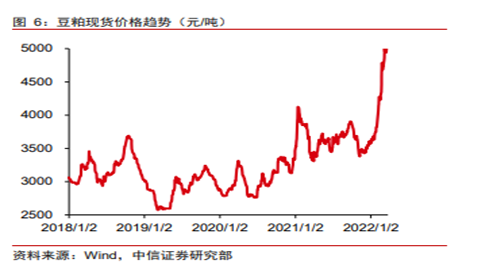 三大主粮之外,部分农产品进口依赖程度比较高,最典型的是大豆。近年来我国大豆整体的进口量占我国消费量之比在80%以上,自给率比较低,受外部环境影响比较大。大豆的副产品豆粕作为饲料的重要组成部分,成本占比在15%以上,价格走高会显著推高养殖成本。