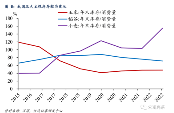 库存消费比:库存消费比是本期期末库存与本期消费量的比值,联合国将17%-18%设定为警戒线,低于警戒线则可能会有危机发生。根据信达证券研究所报告,目前小麦的库存消费比超过了100%,玉米、稻谷的库存消费比都超过了45%,均远高于国际警戒线。