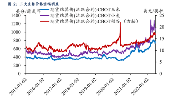 虽然我国主粮的自给问题不大,但在全球联动的体系下,粮食价格也出现一定上行,只不过幅度低于国际水平;同时近年来,极端天气频发、农资成本上行等亦在推动粮食价格走高。在全球粮食危机的大背景下,粮食安全一定是之后很长一段时间市场关注的热点。
