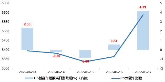 6月13日至6月17日跟踪标的CS新能车指数(399976.SZ),周五出现周最大涨幅4.19%,截至周五收盘,指数全周共上涨6.02%,高于沪深300指数4.37个百分点。