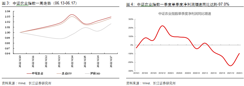 两周表现回顾:上周中证农业指数的收益率为2.95%,跑赢沪深300的1.65%;行情波动适中;中证农业指数2022年年初至今的收益率为-2.91%,大幅跑赢沪深300的-12.78%。