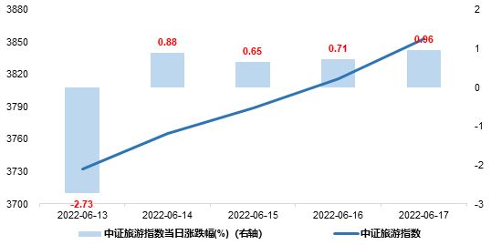 上周中证旅游指数在周一下跌后连续四天上涨,全周累计上涨0.48%,相较沪深300指数跑输1.19个百分点。