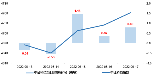 上周中证科技指数总体上行,全周涨跌幅为1.74%。其中,周三、周四、周五上涨,涨幅分别为1.46%、0.35%、0.80%,周一、周二下跌,跌幅分别为-0.34%、-0.53%;指数当周收于4762.34。
