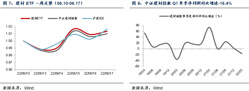 上周表现回顾:上周中证建材指数的收益率1.0%,跑输沪深300的1.7%;中证建材指数整体行情波动大于沪深300。中证建材指数年初至今的收益率为-13.4%,跑输沪深300的-12.8%。