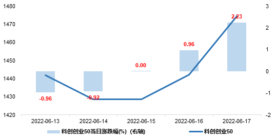 上周科创创业50指数震荡上行,全周累计上涨1.32%,相较沪深300指数跑输0.35个百分点。