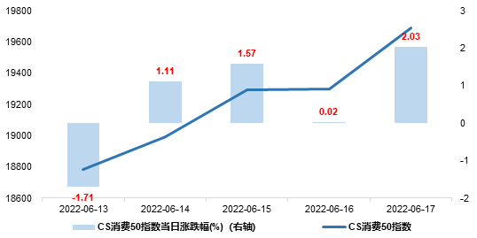 上周CS消费50指数随A股行情继续走强,全周累计上涨3.02%,相较沪深300指数跑赢1.35个百分点。
