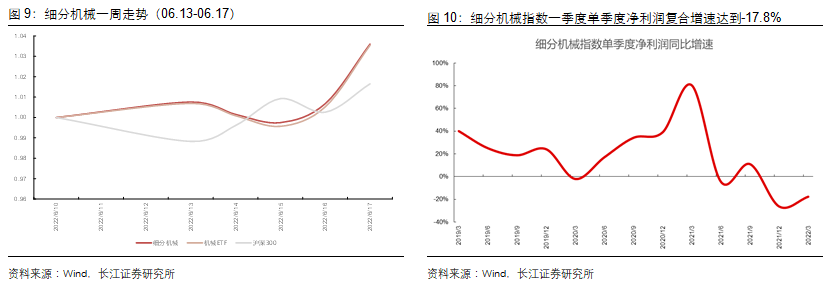 两周表现回顾:上周细分机械指数的收益率为3.60%,跑赢沪深300的1.65%;机械指数行情整体波动较大。细分机械指数2022年年初至今收益率为-11.53%,小幅跑赢沪深300的-12.78%。