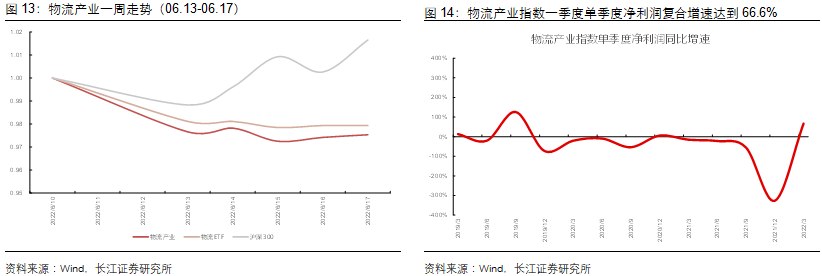 两周表现回顾:上周物流产业指数的收益率为-2.47%,跑输沪深300的1.65%;物流产业指数行情波动略小。物流产业指数2022年年初至今的收益率为-4.98%,大幅跑赢沪深300的-12.78%。