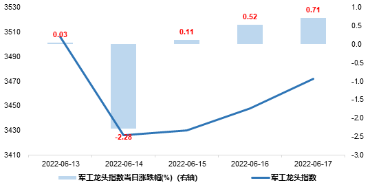 上周军工龙头指数总体下行,全周涨跌幅为-0.91%。其中,周一、周三、周四、周五上涨,涨幅分别为0.03%、0.11%、0.52%、0.71%,周二下跌,跌幅分别为-2.28%;指数周五收于3472.06。