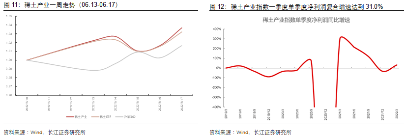 受供需关系仍然紧平衡的影响,稀土行业景气度维持高位。稀土产业成分股全部公司均披露了年度报告和2022年一季度报告,指数整体2021年全年净利润增速达到119.1%,稀土产业整体处于高景气状态;行业2022年一季度净利润增速为31.0%,净利润增速仍相对较高,但绝对水平已经有所下降。
