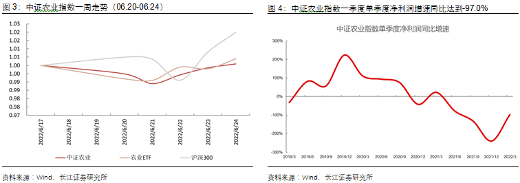 年报&一季报情况:中证农业成分股全部公司均披露了年度报告以及2022年一季度报告;虽然当前猪价仍处于低位,畜牧养殖行业单季度行业整体净利润为负,但农业整体净利润水平已经转正。年度报告方面,中证农业整体的2021年全年净利润增速为-103.5%,行业整体增速来到历史极低位置;一季报方面,中证农业整体的2022年一季度增速回到-97.0%,增速水平仍较低,但行业整体净利润水平已经转正,企业盈利能力逐步复苏。