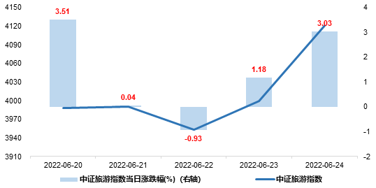 上周中证旅游指数震荡上行,全周累计上涨6.94%,相较沪深300指数跑赢4.95%。