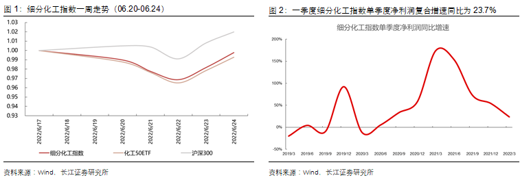 受疫情以及国内需求等多重因素影响,化工行业公司业绩回落幅度明显。细分化工成分股所有公司均披露了年度报告和2022年第一季报报告;年度报告方面,细分化工整体的2021年全年净利润增速到达103.3%,仍处于较高水平,行业整体增速仍相对较快;一季报方面,细分化工整体的2022年一季度增速已经回落至23.7%,回到相对正常水平,企业盈利能力仍较强。