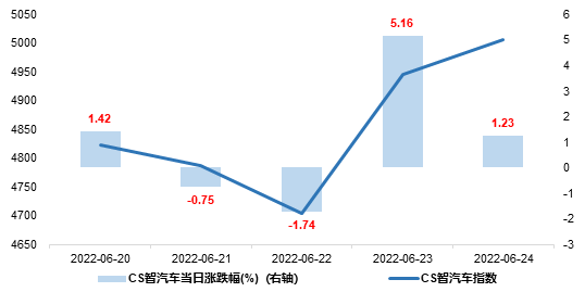 上周CS智汽车指数震荡上行,全周累计上涨5.29%,相较沪深300指数跑赢3.3%。