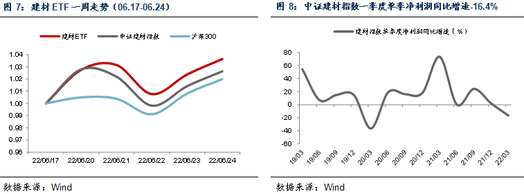 上周表现回顾:上周中证建材指数的收益率2.6%,跑赢沪深300的2.0%;中证建材指数整体行情波动大于沪深300。中证建材指数年初至今的收益率为-11.1%,跑输沪深300的-11.0%。