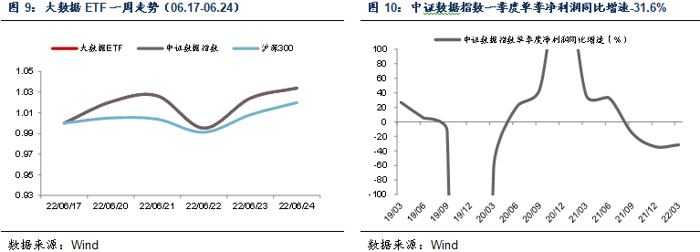 上周表现回顾:上周中证数据指数的收益率3.4%,跑赢沪深300的2.0%;中证数据指数整体行情波动大于沪深300。中证数据指数年初至今的收益率为-25.0%,跑输沪深300的-11.0%。