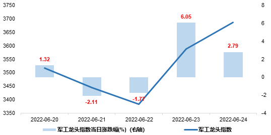 上周军工龙头指数总体上行,全周涨跌幅为6.20%。其中,周一、周四、周五上涨,涨幅分别为1.32%、6.05%、2.79%,周二、周三下跌,跌幅分别为-2.11%、-1.77%;收于3687.29。