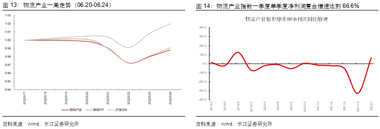 受供需关系仍然紧平衡的影响,物流行业景气度维持高位。物流产业成分股全部公司均披露了年度报告和2022年一季度报告,指数整体2021年全年净利润增速为-82.9%;2022年以来板块业绩大涨,行业2022年一季度净利润增速为66.6%,净利润增速较高,后续业绩的较高增速或仍将维持一段时间。