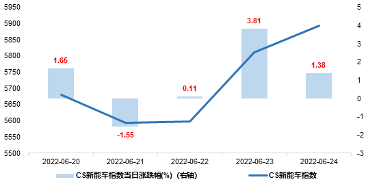 6月20日至6月24日跟踪标的CS新能车指数(399976.SZ),周四出现周最大涨幅3.81%,截至周五收盘指数上涨5.44%,高于沪深300指数3.45个百分点。