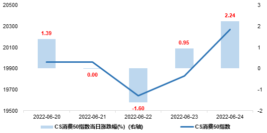 上周CS消费50指数周一上涨,周三下跌,周四反弹,周五延续上涨,累计上涨2.97%,相较沪深300指数跑赢0.98%。