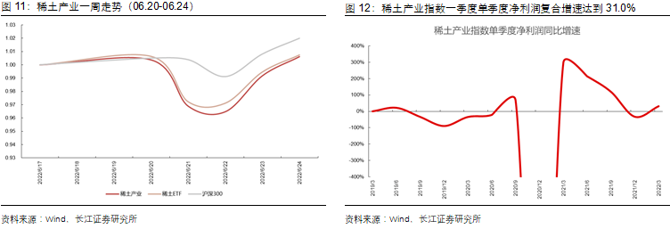 受供需关系仍然紧平衡的影响,稀土行业景气度维持高位。稀土产业成分股全部公司均披露了年度报告和2022年一季度报告,指数整体2021年全年净利润增速达到119.1%,稀土产业整体处于高景气状态;行业2022年一季度净利润增速为31.0%,净利润增速仍相对较高,但绝对水平已经有所下降。