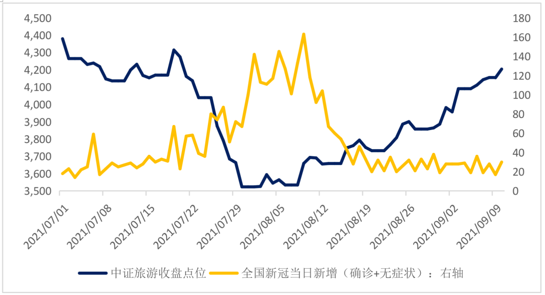 疫情见顶之时也是旅游触底之日:复盘去年南京疫情可以看出,在新增人数创阶段新高之时,旅游基本上也到了底部的位置,随着新增人数的下降,旅游开始触底反弹,该轮反弹延续至9月10日,反弹幅度超过19%,抹平了疫情以来的跌幅。