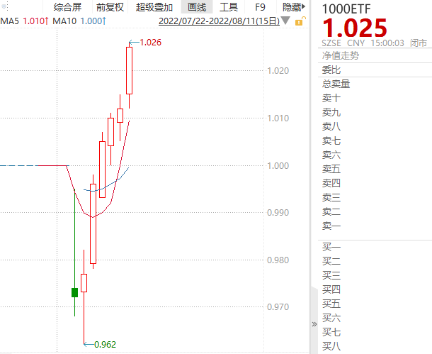 1000ETF(159629)上市之后,连拉6根大阳线!股价节节攀升,价格上涨到1.025元,上市7个交易日,收益率达到2.5%。