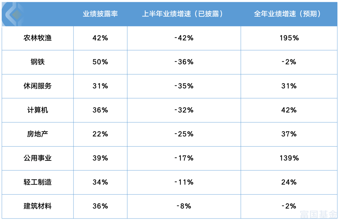 用同样的方法,级掌柜梳理了各个行业半年报(包括业绩快报)的业绩披露率、上半年业绩增长情况、以及分析师预期的全年业绩增速,最后得出结论: