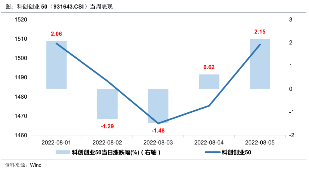 上周科创创业50指数震荡上行,全周累计上涨2.07%,相较沪深300指数跑赢2.35个百分点。