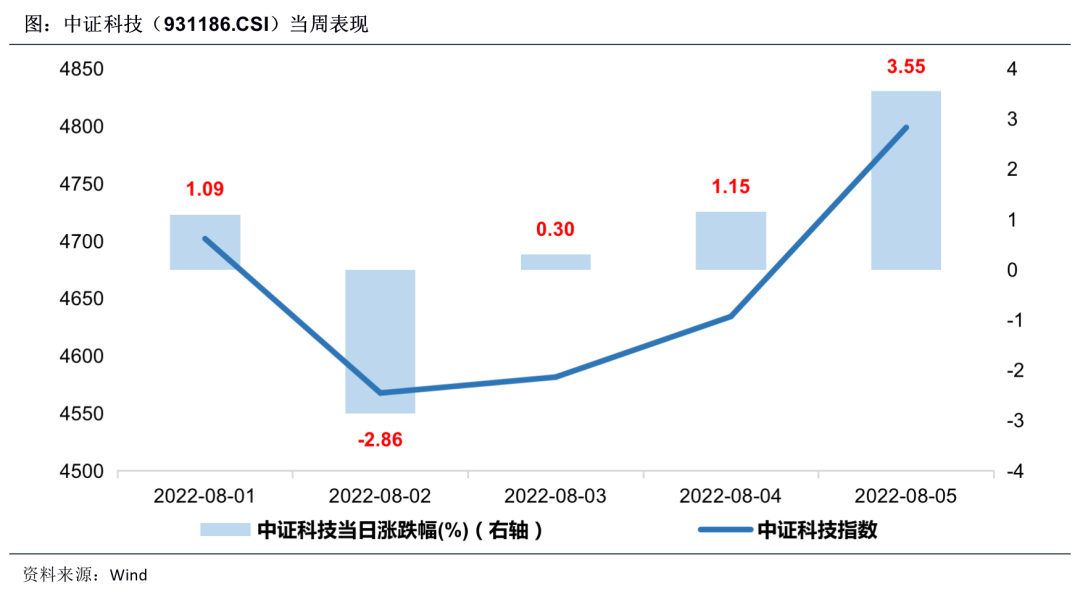 上周中证科技指数总体上行,全周涨跌幅为3.24%。其中,周一、周三、周四、周五上涨,涨跌幅分别为1.09%、0.30%、1.15%、3.55%,周二下跌,涨跌幅分别为-2.86%;收于4798.75。
