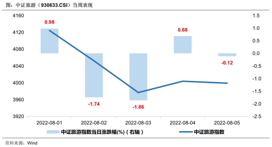 上周中证旅游指数震荡下行,全周累计下跌2.06%,相较沪深300指数跑输1.78个百分点。
