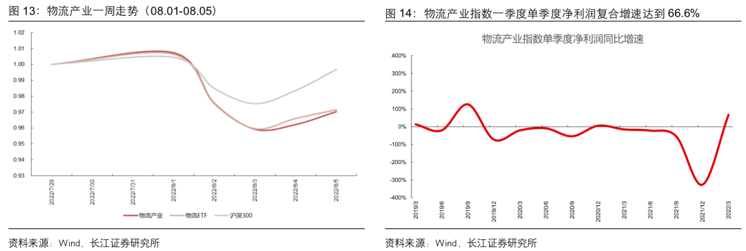 上周物流产业指数的收益率为-2.97%,跑输沪深300的-0.32%;物流产业指数行情波动较高。物流产业指数2022年年初至今的收益率为-8.93%,跑赢沪深300的-15.86%。