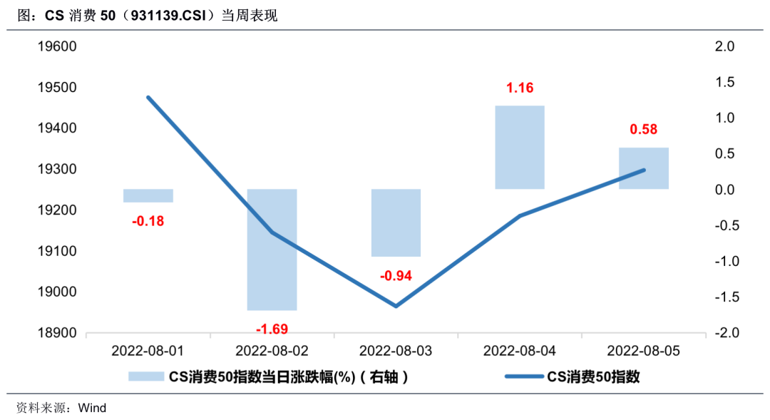 上周CS消费50指数经历连续三天下跌后,周四周五反弹。全周累计下跌1.07%,相较沪深300指数跑输0.79%。