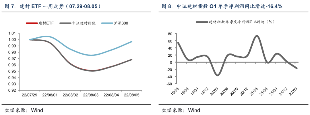 大宗建材方面:基建投资及其实物需求继续处于加速期,我们认为水泥行业最差的时候已经过去。除了各地错峰停窑落地使得库存止升回落以外,更重要的是基建投资回升加速向实物需求传导,三四季度有望集中释放。预计8月有望看到出货率进一步的提升和库存的下降,近期已经看到部分地区开始试探性提价,我们判断后续季节性因素下随着出货率出现显著上升,全面涨价的进程也将逐步开启。需求回升叠加行业协同的修复,仍看好下半年旺季的价格弹性,尤其是产能利用率比较高、行业格局良好的沿长江市场。疫情管控缓和后终端需求改善,叠加行业盈利低位下冷修节奏有所加快,近期库存上行显著放缓,下半年旺季的到来以及保交付政策的落地有望推动玻璃需求环比继续回升,玻璃作为后周期品种有望迎来反弹。