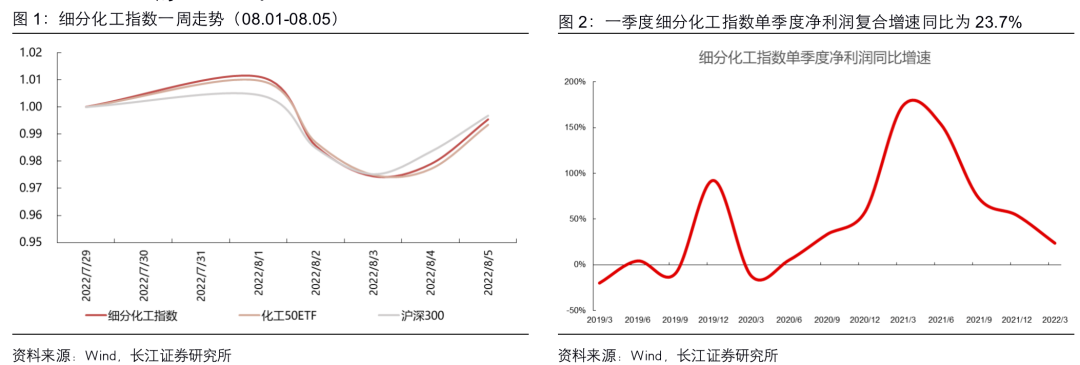 上周细分化工指数的收益率为-0.46%,跑输沪深300的-0.32%;板块整体行情波动适中;细分化工指数2022年初至今的收益率为-14.13%,跑赢沪深300的-15.86%。