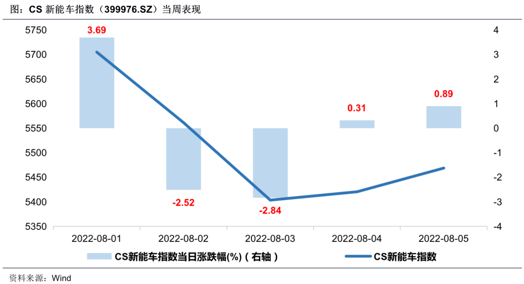 上周,新能源汽车板块宽幅震荡,其中中证新能源汽车指数(399976.SZ)上周(8.1-8.5)下跌0.61%。上周,部分新能源汽车企业陆续发布7月销量,根据已披露的10家新能源车企销量统计显示,7月合计销量为26万辆,同比增长172%,环比增长9%,其中自主品牌及二线新势力销量亮眼,淡季不淡,预计7月销量有望超过此前市场预期。海外方面,欧洲主流九国7月合计销量12.7万辆,同比回落4%,环比回落30%,销量仍受限制供应链紧缺,全年销量预期230-250万辆,同比增长10%。美国方面,7月销量为8.6万辆,同比增长47%,环比持平,预计全年有望超110万辆,同增长70%。近期美国新能源车政策提案重启,预计本周参议院有望通过,对2023年美国新能源汽车行业增长有较大推动作用。另外,从行业排产来看,8月行业排产环比增长10%,3季度预计环比增40-50%,高景气度持续。(数据来源:东吴证券研究所)