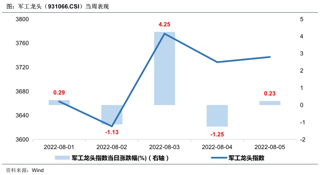 上周军工龙头指数总体上行,全周涨跌幅为2.39%。其中,周一、周三、周五上涨,涨跌幅分别为0.29%、4.25%、0.23%,周二、周四下跌,涨跌幅分别为-1.13%、-1.25%;收于3736.92。