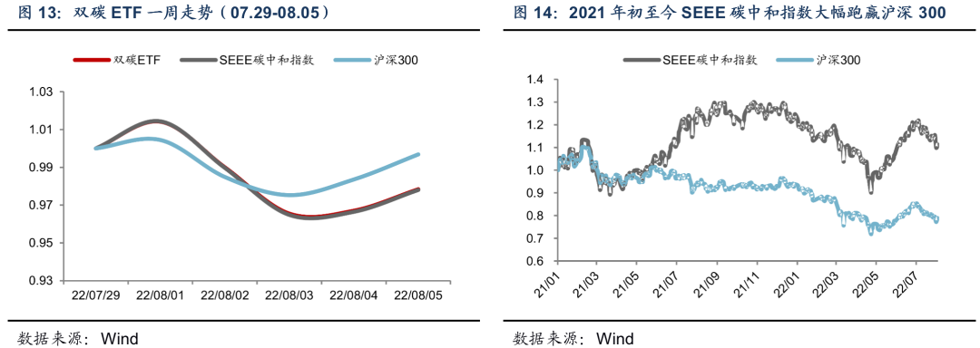上周SEEE碳中和指数的收益率-2.2%,跑输沪深300的-0.3%;SEEE碳中和指数整体行情波动大于沪深300。SEEE碳中和指数年初至今的收益率为-10.7%,跑赢沪深300的-15.9%。