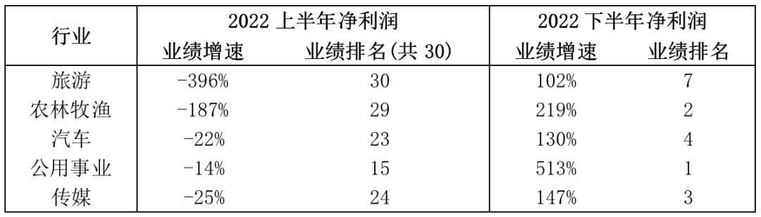 1、逆境反转行业:农业、旅游、公用事业、汽车、传媒。虽然上半年这几个行业处于“巨亏”或者“业绩一路向下”的状态,但是根据分析师预期,下半年这几个板块的业绩可能会有大幅改善;