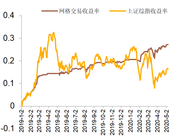 ●网格交易降低了收益波动和回撤,比如2019年4月到6月上证指数下跌15%,但网格交易策略基本无回撤。