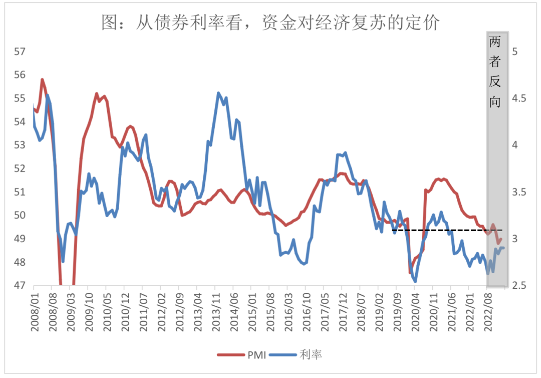 客官们可以看下图,最近经济(PMI,红色线)还在下往下走,但利率(蓝色线)已经向上了。